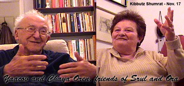 Text to come Transcription (edited) of video clips: Part 1 • Part 2 • Part 3 • Part 4 • Part 5 • Part 6 • Part 7 • Part 8 Part 1 - In this first segment, which I will not transcribe at this time, we chat about their family, work life and kibbutz roles. Chaya became a psychologist, specializing in child and family practice; Yaacov worked in many roles on the kibbutz and for a while was in the Ministry of Agriculture for the state of Israel. I ask Yaacov where he was born and about his earlier experience. He was in the Russian army in WWII. His parents and family died in the Transnistria, as the Holocaust in NE Romania and southern Ukraine is known. Chaya tells me that was born in Hungary, and was 17 in 1944, when the Germans came. He family was all sent to Auschwitz. They all died there. Only she survived. She describes being liberated by British soldiers, and then, three weeks lataer, some people (it isn't clear who, but I think from Israel), preparing the survivors to learn Hebrew and come to Israel. "I was a Zionist," she says. When she met them, she tells me, she knew she would come to Israel, and not go back to Hungary. There was nothing to go back to. Part 2 - Chaya: It was '46, in August, when I came to Haifa . Srul: (translating) They came with the illegal immigration. Chaya: We were three or four weeks; they … Srul: …They prepared them for the trip, and what to do once they got here. In Italy . They were waiting for a ship in Italy . Chaya: Yaacov was in same place, on the beach. Srul: So, that's where they met. Chaya: He was… Srul: He was in charge of health. He studied medicine before he was drafted, enscripted into the army. Chaya: I came with my group and for me give some pills, and said if, and I write, if you have headache I give this, it you have diarrhea you give this and when we come to this camp… Srul: (translating and summarizing) The first day that they met, he was working with a Polish doctor, and he made an aside, and old drunk he said. The first time they met, he proposed to her. She was going to get medical equipment, medicine and everything. Peter: And instead, she got him! And when you first came to Israel , you came to Haifa ? Yaacov: Yes, to Haifa . But, the English soldiers took us back to Cypress . The lagan…the camp… Chaya: We were there three months. Yaacov: We were on the (ship name?). It was very difficult the conditions. And in the lagan in Cypress it was a little better. We were free to do…but we could not go out from the lagan. This was very difficult for the people who come from a concentration lagan and after the liberation, more was. Chaya: Two weeks we were in Haifa . Srul: They were in Haifa for two weeks, then on the boat for two weeks, then they went to Cypress after that. Peter: Because the British wouldn't let them land? Srul: Right. Three months they were in Cypress and then they came to Israel . A lot of people had to wait, but there was a quota. How many they would let come into Israel . Yaacov: It was a very strong relation between the Hagana and the people in the camps. And they organized a few main person from the Hagana came to the camps and they organized young people to be ready to go to fight. Srul: They gave them military training. Yaacov: We were a group organized to go to a kibbutz; so we went not to the army directly when we arrived, but we were like soldiers in the place where we stayed. Really, in times from the war, the Druz - they are now friends of Israel - attacked the settlement where we stayed, in '47, '48… Chaya: '47. In September we came from Gran Shmuel. Yaacov: So that this was in the beginning of '48. They attacked us. And we were soldiers, to fight. Peter: The Druz attacked you? Srul: The Druz are loyal to the country. Now they're loyal to Israel . Then they were loyal to the British and to the Arabs. And the Druz in the Golan Heights are loyal to the Syrians. And the Druz in Lebanon are loyal to the Lebanese. Yaacov: After the wars, the Druz finished to fight against Jews, and they began to be with us. There were four settlements: the place where we was in '47, '48 was four settlements: Rabat Yohanon, Bal Macavi, Hoosha and Tiyoslim. We were in Tiyoslim. This was our first name. Srul: Shamrat had an earlier name. It was in a different place. Yaacov: After that, when we arrived at the place where you stay, now we kept the name Shumrat. Shumrat is one from the sons Asher. And this region belonged to the tribe of Asher. Srul: There's a scout camp in the place where the original settlement of Shumrat was. Peter: And where is that? Srul: It's between here and Haifa . And a little bit east. The three other kibbutzim are still there. (They withstood an attack from Syria during the '48 war.) Part 3 - Peter: What about the early days of this kibbutz? Can you tell me a little bit about how the kibbutz started and how it grew and what were your challenges? Yaacov: They say when someone takes an ideology and is busy (trying) to build something, he has not enough time to think about his maladies. Now, the situation on the kibbutz is a little older than it was, and we are older. We see not the same view on the life in the kibbutz like was 50 year ago. Peter: What has changed? Yaacov: Fifty years ago we received for breakfast half an egg and a little piece of herring. We had a plan to do something. This was important. And it was easier to live. This is not the same kibbutz, not the same people who stay today on the kibbutz. We have 60 or 65 or 70 people who are more like 70 years, 65 years. And no all was in the first group, but we begin to get at this. And the people who came later they have other ideas, too. Peter: Okay. In the beginning, how many people came to start this kibbutz? Yaacov: In '48 we were 140 people. A lot of left the kibbutz, but until now we have, together the people who stay in the cemetery, I think we have 85. Chaya: I think now 65 (living). Srul: There's another couple of tens