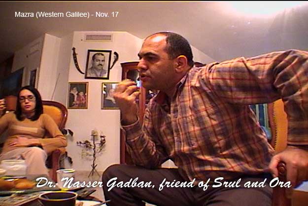 When the kibbutz lost its dentist, Dr. Gadban started keeping part-time office hours there (where Ora is hygenist and office manager). She also works with Nasser in his other office (I think in Naharia). We visited Dr. and Mrs. Gadban at their home in Mazra, an Arab village down the aqueduct toward Acco. The conversation ranged from the history of the village to the conflict and possible solutions, and also to the role of the US in the region. Transcription (edited) of video clips: Part 1 • Part 2 • Part 3 Part 1 - Before I turned the camera on, we started discussing the village, which was formed in 1948 by refugees from five neighboring villages who fled or were forced out by Israelis. Peter: So is that all long in the past and forgotten? Or do the people here, the 3,000, do they think they are refugees from their land and do they still feel like their land was taken away from them and they resent it, or what would you say about that? Nasser: You know maybe this relation between the land and between the citizens it is maybe something everyone, of course, he would like to have this land back. Everyone. But the question is, is it possible. Maybe they are convinced that they cannot get it back. If you ask them if they would like to have it, of course they'd like to have it back. Of course. Everyone. For example, as I told you, my father and my father's family has about 30 dunam (land registered in their name in the Turkish registry). We have the Turkish documents. The title of the land is still written in my grandfather's name from the Turkish period. Peter: But this is the same land that a kibbutz is on now. And do people hope to go to court and get it back? Nasser: I know a lot of people who changed these lands a lot of years ago. When they change it the Israel state gave them one donum for one donum. That means every donum lost, they got in another part another donum. But now if you like to change it (I mean for the past 25 years, if you want to change this land with other land where you live now, they just give you 500 dollars for the one donum. It's better for you not to change anything. Peter: Because you won't get full value. Nasser: You know I want to tell you something. We are Israelian and at the same time we are Palestinian. We cannot deny. But first we are Israelian, because we live in Israel. And it is a little bit different between the people who live here and the people who live in the occupation on the other side. It is very big difference between us. Here we are fighting for equality, the same as other Israelian citizens. As the Jewish citizen in Israel. This is our hopes. But that doesn't mean that we are two people. The Palestinians here, we cannot make two parts of Palestinian people. Let me explain it to you what the resolution of the Palestinian program (will be). We want (a solution) as quickly as possible ... Peter: ...because many people here must have relatives in the West Bank or in Lebanon or something. Srul: The Israeli Arabs, a lot of them, identify themselves as Israeli citizens and they feel their struggle for equality means that they want to better their life but they want to remain in Israel. So there is a difference between the Israeli Arabs and the Arabs who are living in the West Bank or in the Gaza area. But it's impossible to ignore the fact, first of all on a humanitarian level. These are another people. They're also relatives or from the same people, from the same nation. To see the suffering that their fellow Palestinians are living through motivates them. They want the problem solved as soon as possible. The feelings that the Israeli Arabs have right now is that they're suffering from collective punishment. Whatever is happening. Say there is an attack. At Hebron or Kibbutz Metzner or some other place, Arabs from this village fear going to Naharia. And if they go they'll be embarrassed to talk in Arabic. Peter: So you feel like a second class citizen, as we would say in the United States. What do you need to be an equal citizen in Israel today? What changes have to happen in Israel before you will not be a second class citizen? Nasser: You know if you go to any official places. Let me tell you an example. I hope that one time, my passport, they will not write there that I am Arabic. I'm Israeli. Yes? Why to do that? I hope one time to be written there that I'm Israeli, and not Arabic. Or not that I'm a Muslim. I want to be equal with all the other citizens. Srul: This is a problem with a lot of Jews in Israel, also. It's on your passport, it's on your identity card, the question of religion. There are a lot of Jews also saying ‘I don't have a religion.' But it's more of a problem for the Arabs or for anybody who isn't Jewish. Nasser: I'm speaking of discrimination. But, you must know that the main problem must be resolved first. Peter: And what is that? Nasser: To be here, two states – Israeli and Palestinian, one beside the other. This must be resolve first. And if it would be resolved, I really will feel that the first and the only problem (that will remain) is the discrimination inside. Because you feel all the time the people suffer every day. And the patience still continue to be. It just makes a very bad feeling. Something must be done. And after that, equal opportunity to work. Part 2 - Srul: I want to ask you, your cousins in Lebanon were refugees; would they settle for a solution that did not include them coming back to here but maybe settling in the West Bank? Srul (paraphrasing and translating): The hardest problem that needs to be solved, let's say there's a mainstream, including Arik Sharon, that has accepted the fact that the solution to the problem is that (two states)., he's on record already…and I personally believe that the division of Jerusalem, which is going to be part of it, both sides will accept it. The biggest problem is the return of refugees. Srul and Nasser talk in Hebrew. Srul: Okay, ya know, what we were tal
