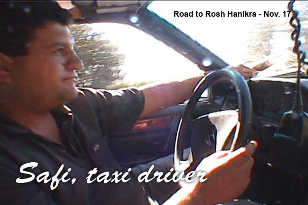 In Naharia we tried to get a bus up to Rash Hanikra, an attraction with limestone caverns up on the Lebanese border. There was no bus up for a couple of hours. Cousin Michael and I had our worse spat of the trip, and thinking back on it, I wonder what it was about. The bus station was full of young soldiers, in uniforms, with guns. Boys and girls waiting for a bus. "Just think," Michael said. "In a year, some of these kids might be dead." I said he was being maudlin, and he took offense at that. He stayed mad at me for the rest of the day. I'm not sure why I felt I had to put down his sentiment; I'm not sure why it affected him so strongly. I think that being there among all those soldiers somehow brought the reality of conflict so close to us. As did the conversation with Safi, the cabbie who took us to Rash Hanikra.